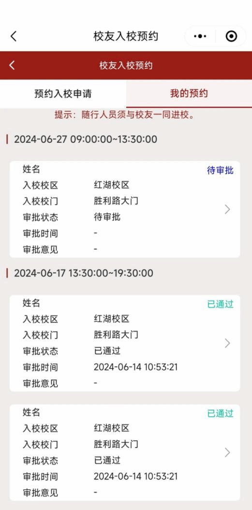 3.如申请同行亲友入校,校友本人须一同入校,否则校友工作办公室有权取消校友本人的预约权限。