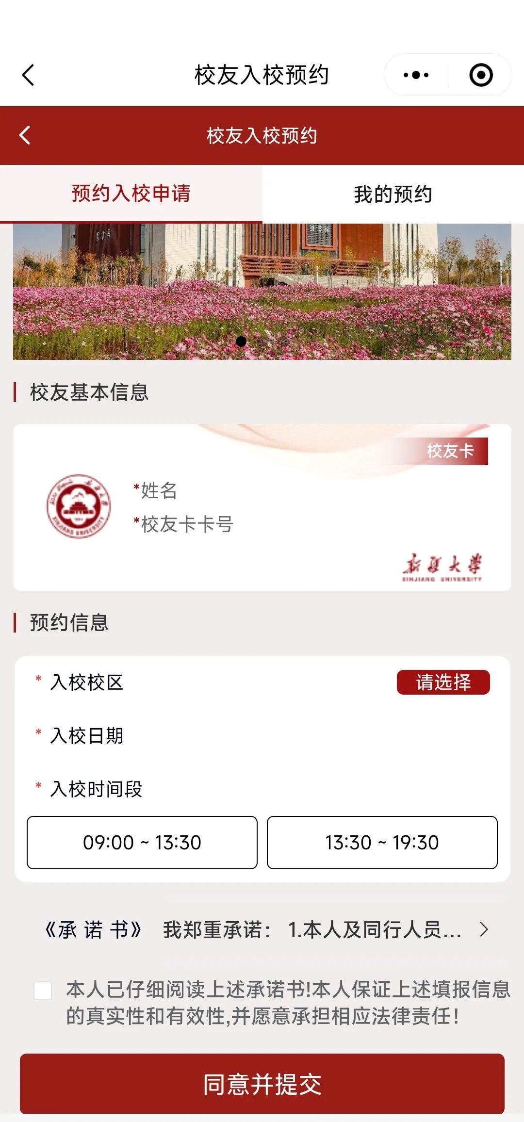 2.校友需在进校前一天18:00前完成预约信息提交,连续7日内只能预约2次。