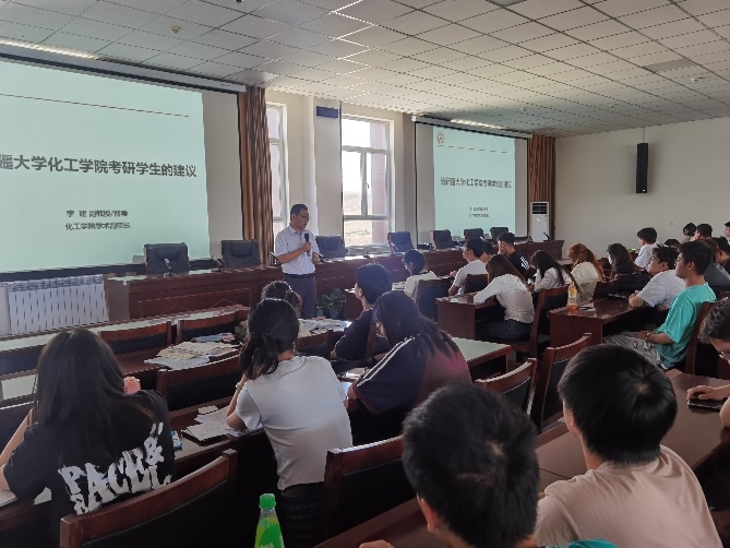 李建副院长现身说法为同学们讲述了自己的考研经历,以此鼓励同学们正视竞争,不惧竞争,拿出勇气,努力追求梦想。同时,介绍了化工学院的学科发展状况,以及如何进行专业选择和学校的选择。