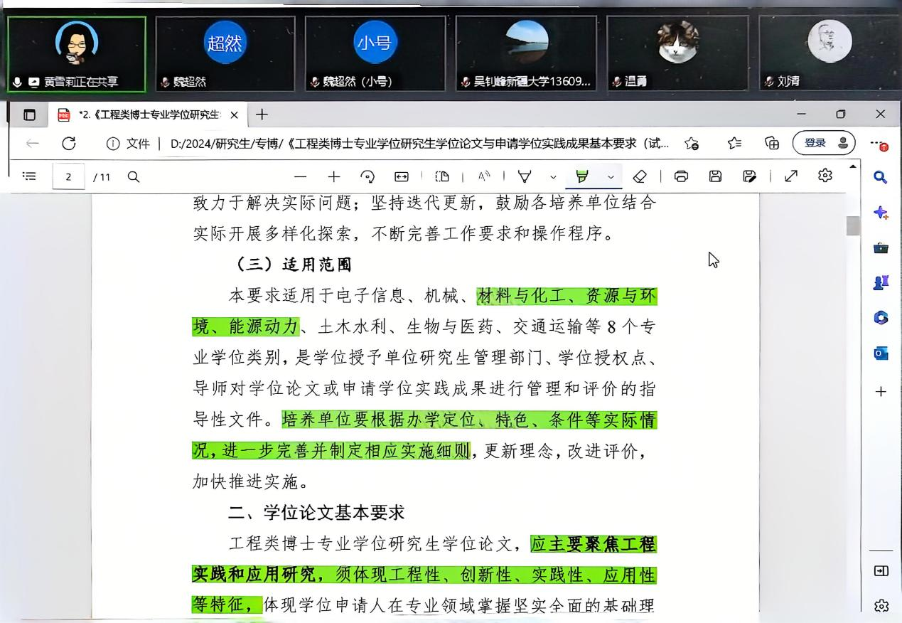 按照研究生院、工程师学院的相关工作要求,12月28日,化工学院通过腾讯会议在线开展为期一天的工程类专业博士研究生导师专题培训。培训会由黄雪莉教授主持,工程师学院院长陶庆教授进行了培训动员。培训播放了全国工程专业学位研究生教育指导委员会于2024年11月29日组织召开的《工程类博士专业学位研究生学位论文与申请学位实践成果基本要求(试行)》专题研修会视频,黄雪莉教授带领大家一起学习了《工程类博士专业学位研究生学位论文与申请学位实践成果基本要求(试行)》主要内容,30余名工程类专业博士研究生导师参加了此次培训。