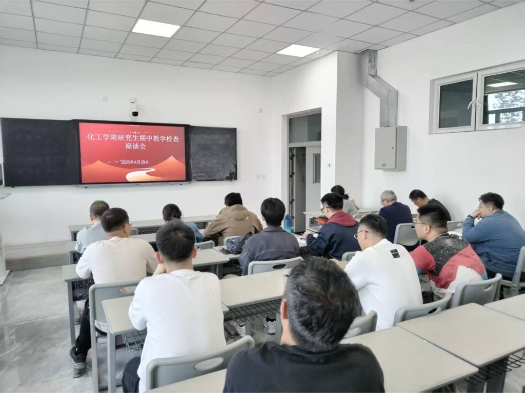 为进一步了解研究生学习生活状态,规范研究生日常教学秩序,加强研究生教学质量监管,根据本学期研究生课程教学安排, 2025年4月29日下午,化工学院在化工楼B106召开研究生期中教学检查师生座谈会,学校教学督导李惠军老师、各学位点负责人、研究生课程任课教师、教学秘书以及各班研究生代表参加。