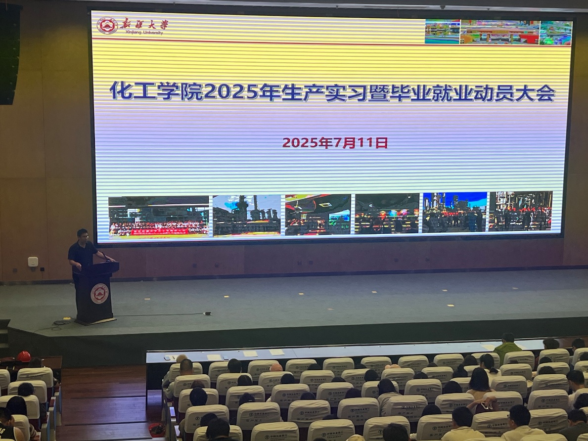 2025 年 7 月 13 日至 26 日,化工学院 2022 级高分子材料与工程等四个专业的 264 名本科生,赴中国石油独山子石化公司开展为期两周的生产实习。在前期生产实习暨毕业就业动员大会上,化工学院党委书记刘岸杰、副院长买买提江·依米提、化工与能源系副主任亚力昆江·吐尔逊、艾沙·努拉洪教授分别就独山子石化简况、生产实习要求、以往生产实习过程中所需注意的安全事项及生产实习的意义等方面进行动员讲话,嘱托负责生产实习的带队教师要强化责任意识、安全意识,保障生产实习有序、安全、稳定地开展;叮嘱学生在生产实习过程中要有集体荣誉感,遵守学校及企业的各项安全管理规定,充分发扬刻苦学习的精神,在实习过程中学有所长,圆满完成生产实习任务,为个人的未来发展打下坚实的基础。学工办曾国航老师主要就化工学院近年来的就业及升学情况进行了讲解和梳理,希望就业抓紧就业黄金期主动择业,考研学子充分利用学校和学院提供的各种资源取得一个满意的考研成绩。
